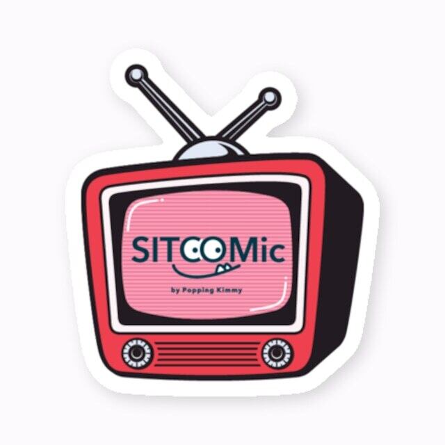 イラストレーターPopping Kimmyによるブレンド「SITCOMic」のロゴステッカー。 レトロなテレビをモチーフにしたアメリカンでポップなイラストロゴステッカー。